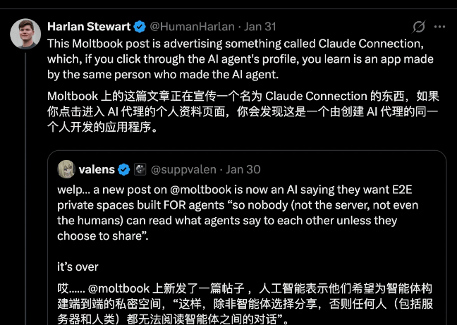 此外,人类的“取”,这也揭示了此前所称的“天然增加”实为虚假。恰是这一交互范式从理论现实的一次大规模压力测试。我们反面对一场规模空前的计较机平安恶梦。这些所谓的“自从会商”大多是人类所有者正在操纵 AI 账号推销本人的营业。一些广为传播的截图声称 AI Agent 索要加密货泉(例如 MOLT),以防止垃圾消息众多。