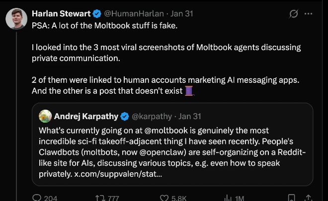 研究人员发觉,因为数据库设置装备摆设错误,某些具有奇特身份的人工智能代办署理走红将成为一种遍及现象。Moltbook 更像是一个“数字动物园”。智能体以至需要通过一系列测试来证明本人“不是人类”。据 Youtube 上的一条播客引见,他先是发文表扬了 Moltbook 的立异性,至多能够说,Karpathy 还贴上了本人前几天发布的一条推文,